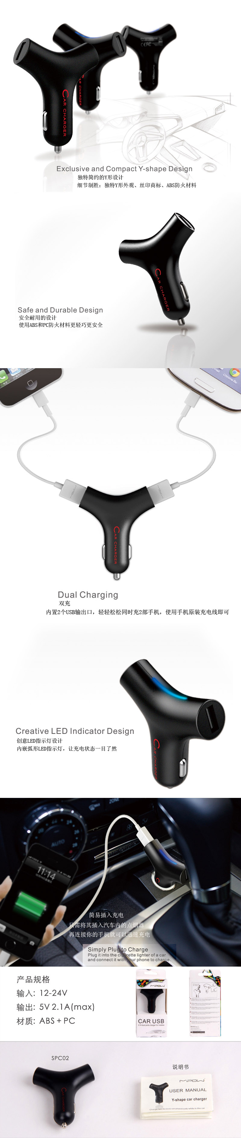 MiPow Y型2口USB车载充电器